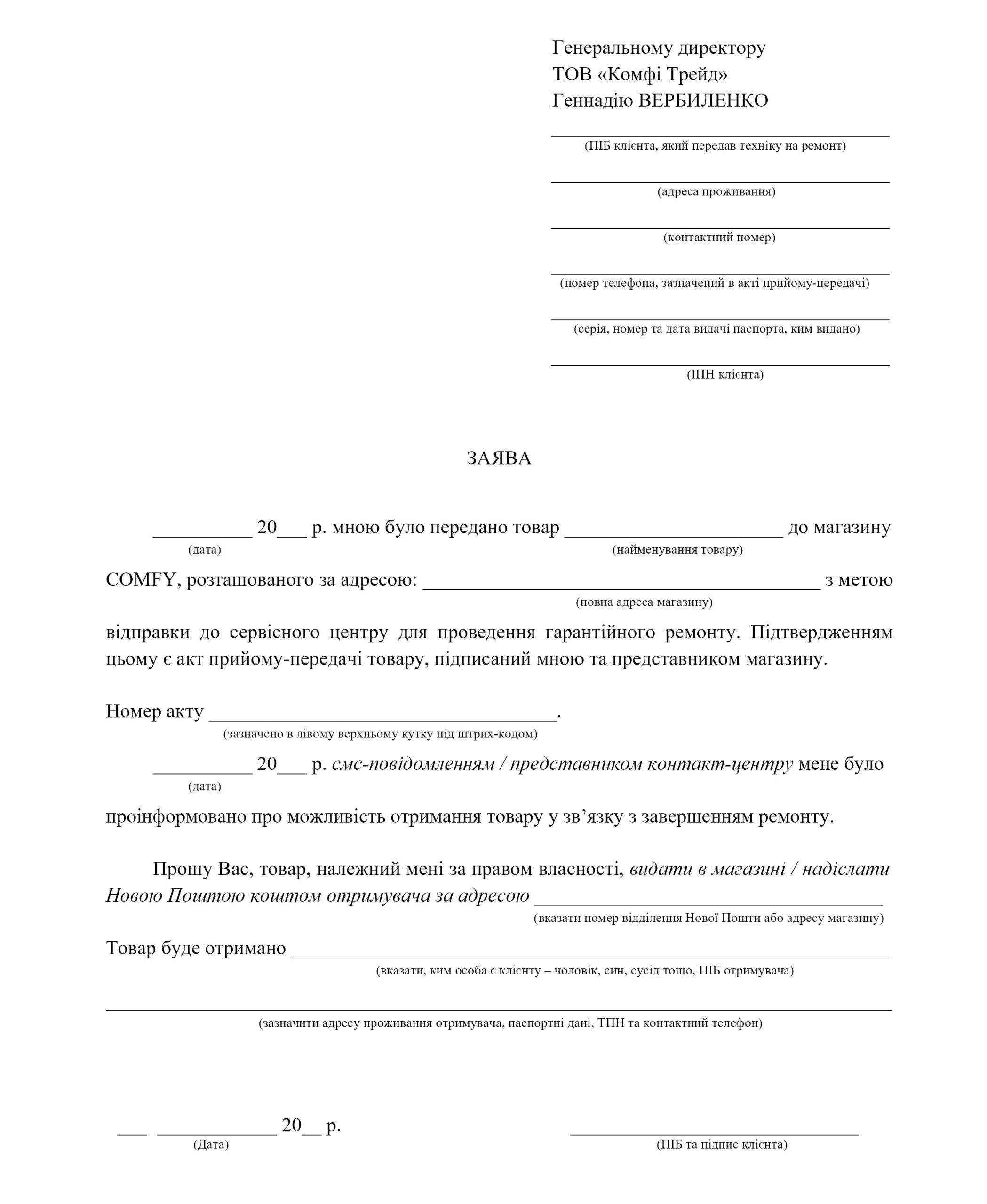 Шаблони заяв на повернення коштів за товар, придбаний в ІМ